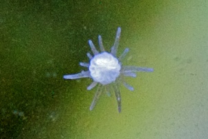 Using the 100mm, I undertook to capture an image of a small creature (about 50 thousandths of an inch across) on the wall of my salt water aquarium. I used live preview, max magnification, and manual focus: