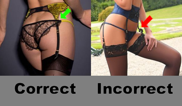 Here's something for ladies new to best lingerie practices. As with many things, when it comes to garter belts and panties, there's a right way to combine them, and a (very!) wrong way. Look carefully at this: